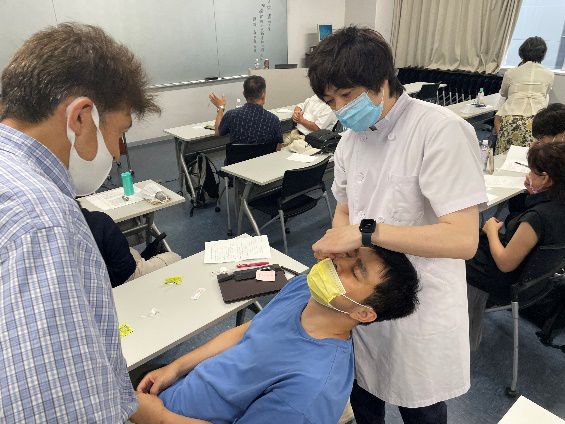 後半の実技のデモストレーションは、嗅覚障害に対する迎香穴に対する刺鍼技術でした。指す方向や深さの他、響かせる技術などポイントを説明しながらの指導で、聴講者は興味津々。コロナ禍の為、マスクは極力外さずにペアを組んで無言で練習実践。在校生は自己刺鍼で練習を行い、各々、鍼の響きの感覚を味わっていました。